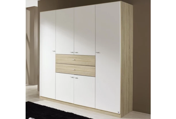 Šatníková skriňa Landsberg má úložné zásuvky umiestnené v komfortnej výške a vnútorné priestory vybavené policami, ktoré možno výškovo nastavovať. Vyrobená v kombinácii dub sonoma / biela.