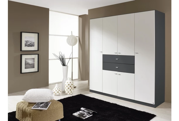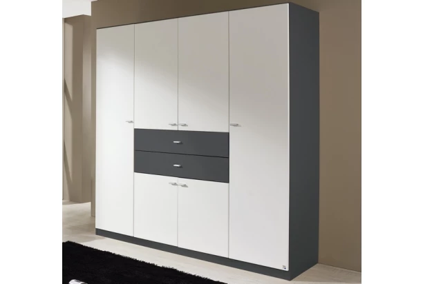 Šatníková skriňa Landsberg má úložné zásuvky umiestnené v komfortnej výške a vnútorné priestory vybavené policami, ktoré možno výškovo nastavovať. Vyrobená v kombinácii sivá / biela.