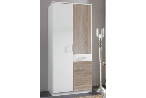 Praktická 2-dverová šatníková skriňa obsahuje kombináciu veľkých i malých zásuviek. Vyrobená v kombinácii bielej farby a dub sonoma.