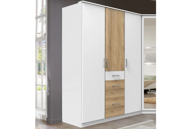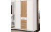Praktická 3-dverová šatníková skriňa obsahuje kombináciu veľkých i malých zásuviek. Vyrobená v kombinácii bielej farby a dekoru doskový dub