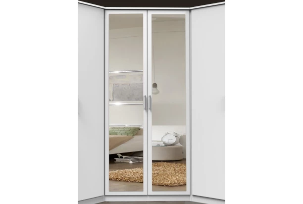 Praktická rohová 2-dverová šatníková skriňa so zrkadlom obsahuje vnútorné police aj šatníkové tyče. Vyrobená v bielej farbe a doplnená zrkadlovými plochami, ktoré opticky zväčšia priestor v miestnosti.