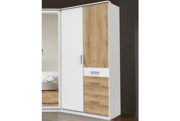 Praktická 2-dverová šatníková skriňa v prevedení bez zrkadla obsahuje kombináciu veľkých i malých zásuviek. Vyrobená v kombinácii bielej farby a dekoru doskový dub.