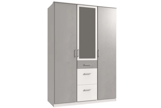 Praktická 3-dverová šatníková skriňa so zrkadlom obsahuje kombináciu veľkých i malých zásuviek. Vyrobená v kombinácii bielej farby a imitácie sivý betón.