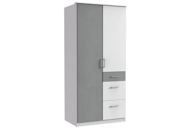Praktická 2-dverová šatníková skriňa v prevedení bez zrkadla obsahuje kombináciu veľkých i malých zásuviek. Vyrobená v kombinácii bielej farby a imitácie sivý betón.
