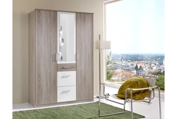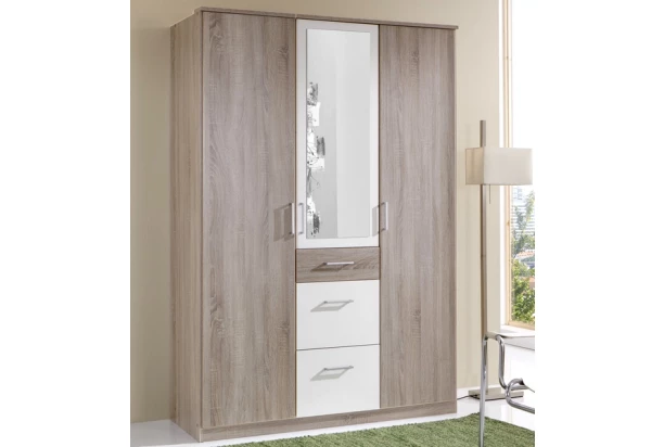Praktická 3-dverová šatníková skriňa so zrkadlom obsahuje kombináciu veľkých i malých zásuviek. Vyrobená v kombinácii dub sonoma/biela stredové plochy.