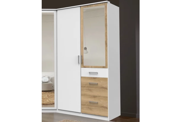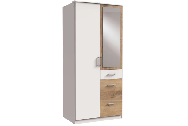 Praktická 2-dverová šatníková skriňa so zrkadlom obsahuje kombináciu veľkých i malých zásuviek. Vyrobená v kombinácii bielej farby a dekoru doskový dub.