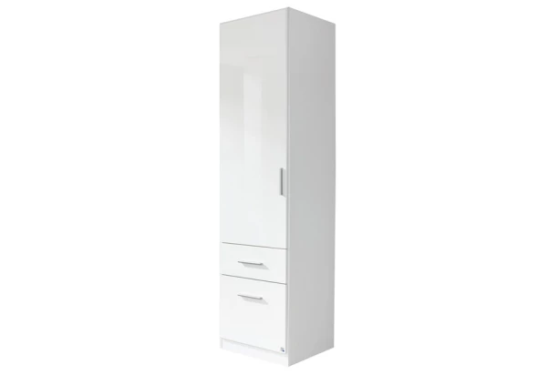 Skriňa v bielom vysokolesklom prevedení pôsobí veľmi luxusne. Minimalistický dizajn v praktickej kombinácii 1 dverí a 2 zásuviek.