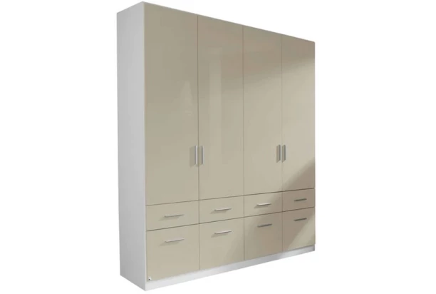 Moderná šatníková skriňa so šírkou 181 cm v kombinácii biela/lesklá pieskovo šedá pôsobí luxusne. Obsahuje 4 otočné dvere a 8 zásuviek. Skriňu môžete ľahko doplniť o ďalšie elementy a zostaviť si tak celý šatník.