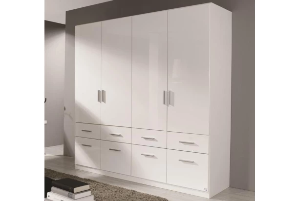 Skriňa v bielom vysokolesklom prevedení pôsobí veľmi luxusne. Minimalistický dizajn v praktickej kombinácii 4 dverí a 8 zásuviek.