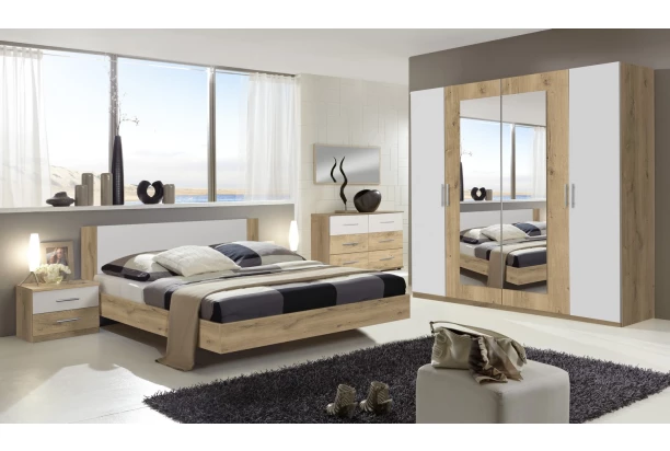 Manželská posteľ s veľkosťou lôžka 180×200 cm s nočnými stolíkmi v kombinácii dekoru doskový dub/biela. Klasicky rovné línie nábytku vytvára moderný a zároveň príjemne pôsobiaci kontrast v priestore spálne.