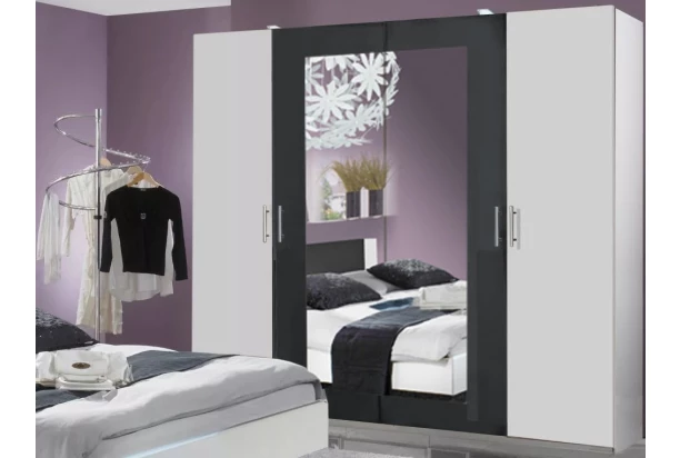 Šatníková skriňa s otočnými dverami s celkovou šírkou 225 cm v kombinácii grafitovo šedej a bielej farby vytvára moderný a príjemne pôsobiaci kontrast. Obsahuje 4 dvere a zrkadlá uprostred.