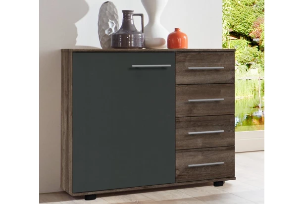 Praktická komoda so zásuvkami v kombinácii dekoru bahenný dub a grafitu vytvára moderný a zároveň príjemne pôsobiace kontrast.