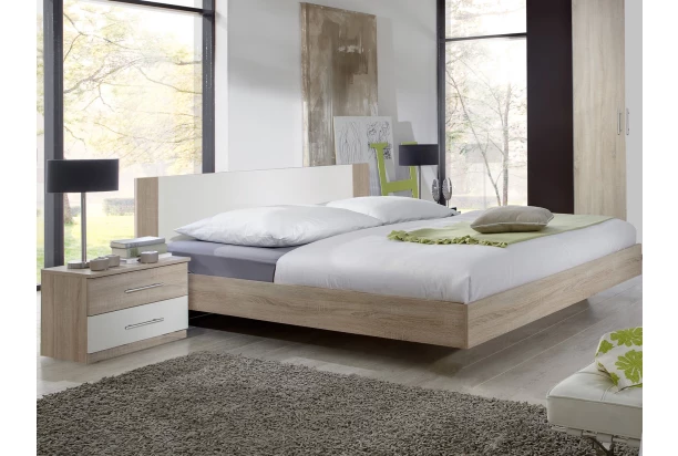 Manželská posteľ s veľkosťou lôžka 180×200 cm s nočnými stolíkmi v kombinácii dekoru dub sonoma/biela. Klasicky rovné línie nábytku vytvára moderný a zároveň príjemne pôsobiaci kontrast v priestore spálne.