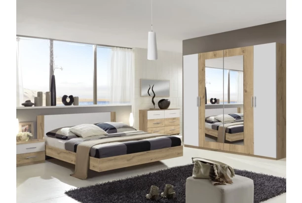Zostava kompletnej spálne v kombinácii doskového duba a bielej farby vytvára moderný a príjemne pôsobiaci kontrast. S posteľou s veľkosťou lôžka 160×200 cm.