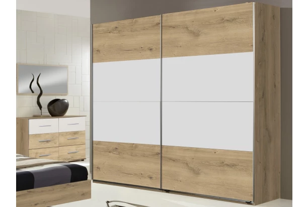 Šatníková skriňa s posuvnými dverami s celkovou šírkou 225 cm v kombinácii doskového duba a bielej farby vytvára moderný a príjemne pôsobiaci kontrast. Obsahuje 2 posuvné dvere, ktoré umožňujú jednoduchú manipuláciu pri otváraní a zatváraní.