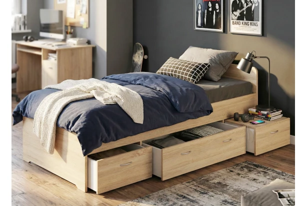 Jednolôžková posteľ v dekore dub sonoma je vhodná ako pre deti, tak pre dospelých. Vybavená 3 praktickými úložnými zásuvkami v dolnej časti, ktoré môžete univerzálne zmontovať na pravú alebo ľavú bočnú stranu postele.