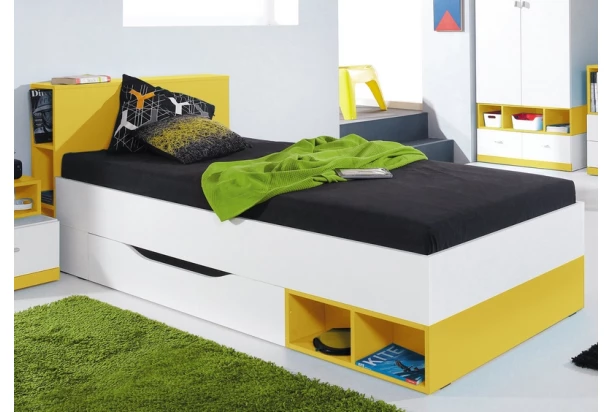 Program nábytku Mobi má nápadito riešenú konštrukciu v bielo-žltej kombinácii farieb. Hodí sa pre zariaďovanie akejkoľvek izby. Posteľ s úložnou zásuvkou.