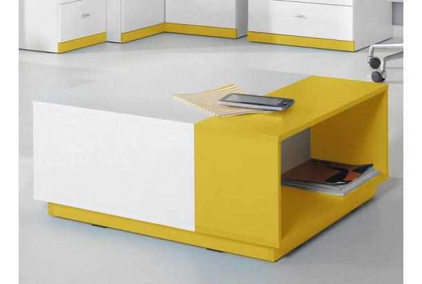 Program nábytku Mobi má nápadito riešenú konštrukciu v bielo-žltej kombinácii farieb. Hodí sa pre zariaďovanie akejkoľvek izby. Konferenčný stolík.