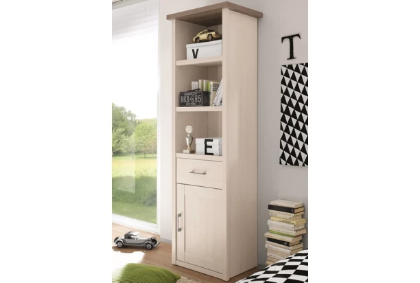 Romantické kúzlo nábytku v elegantnom vidieckom štýle podtrhujú dekoratívne reliéfy predných plôch a kombinácie bielenej pínie s útulnými tónmi dubového drevodekoru.