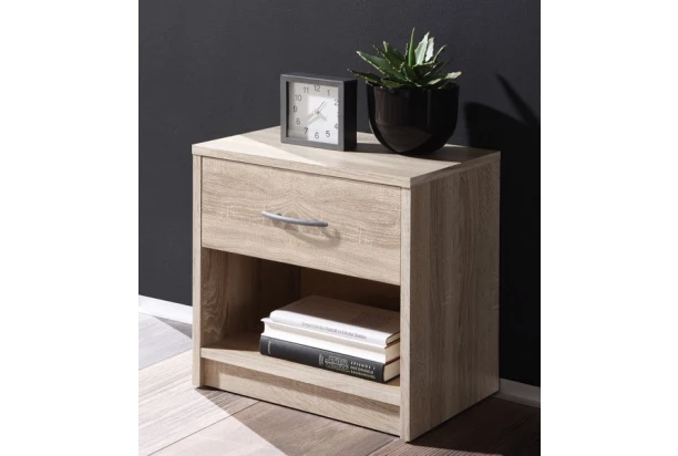 Jednoduchý nočný stolík v dekore dub sonoma so zásuvkou a otvorenou priehradkou. Univerzálny do každej spálne alebo detskej izby.