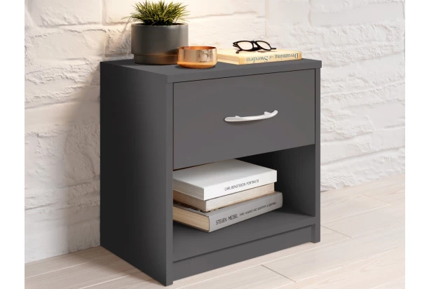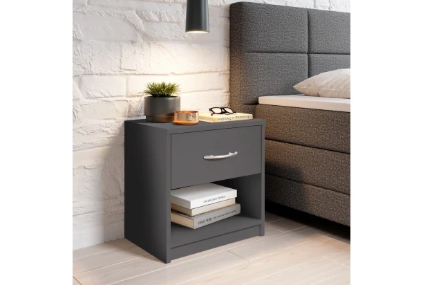 Jednoduchý nočný stolík vo farbe šedý grafit s 1 zásuvkou a otvorenou priehradkou. Univerzálny do každej spálne alebo detskej izby.
