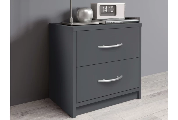 Jednoduchý nočný stolík vo farbe šedý grafit s 2 zásuvkami. Univerzálny do každej spálne alebo detskej izby.