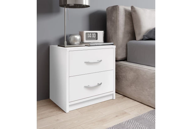 Jednoduchý nočný stolík v bielej farbe s 2 zásuvkami. Univerzálny do každej spálne alebo detskej izby.