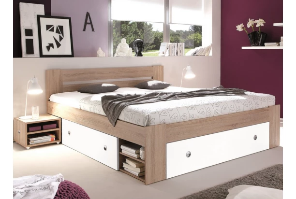 Maximálne praktická posteľ s nočnými stolíkmi, úložnými zásuvkami a bočnými regálmi je ideálna nielen do malého priestoru. Plocha lôžka 140×200 cm, v kombinácii dekore dub sonoma / biela.