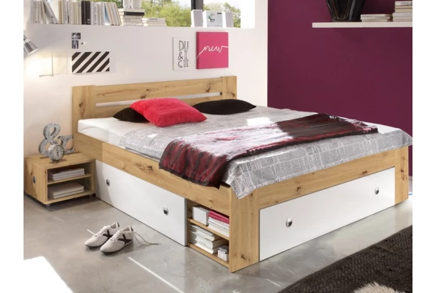 Maximálne praktická posteľ s nočnými stolíkmi, úložnými zásuvkami a bočnými regálmi je ideálny nielen do malého priestoru. Plocha lôžka 140×200 cm, v kombinácii dekore dub artisan / biela.