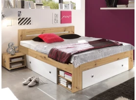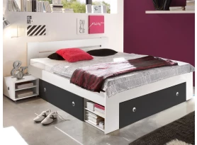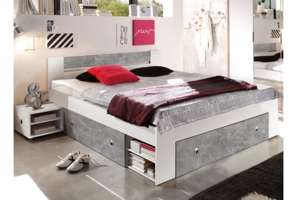 Maximálne praktická posteľ s nočnými stolíkmi, úložnými zásuvkami a bočnými regálmi je ideálna nielen do malého priestoru. Plocha lôžka 140×200 cm, v kombinácii imitácie šedého betónu a bielej farby.