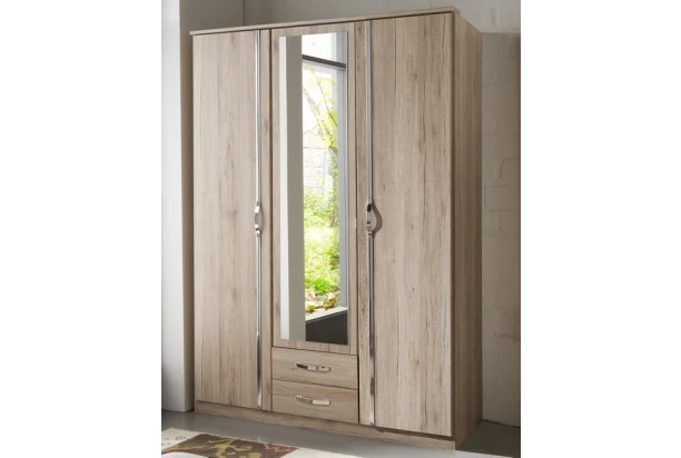 - zvislé línie chrómovo lesklých prúžkov nadväzujú na zaoblené úchyty a moderne zvýrazňujú dubové plochy šatníkovej skrine