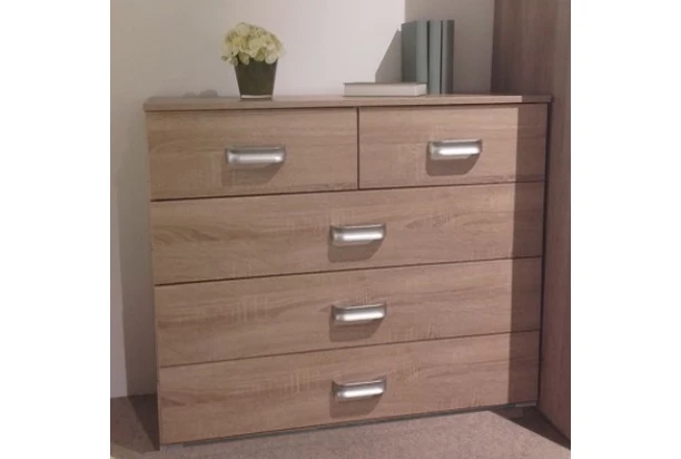 Zásuvková komoda z kolekcie Gandra v dekore dub sonoma. Široké a úzke zásuvky, ponúkajú prehľadné ukladanie vecí v každej miestnosti bytu.