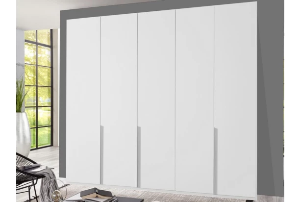 Šatníková skriňa z kolekcie New York D v kombinácii biela/biely lesk sa vyznačuje moderným minimalistickým dizajnom a navyše extra vysokou konštrukciou – do skrine tak môžete uložiť ďaleko viac vecí. Obsahuje 5 dverí, vnútorné police a šatníkové tyče. Možnosť doplnenia o ďalšie police.