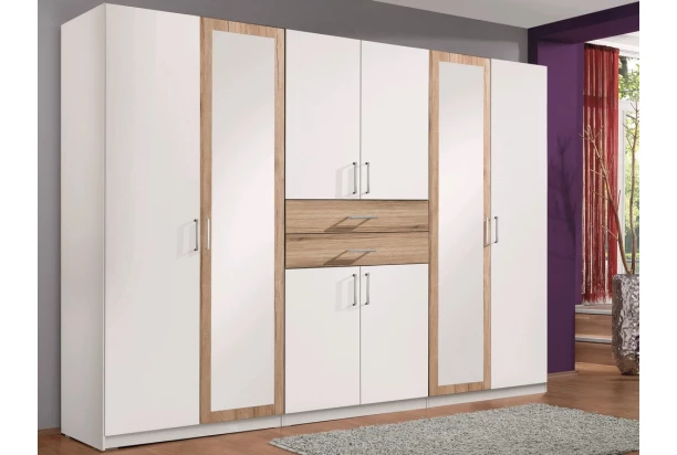 Praktická členená šatníková skriňa s celkovou šírkou 270 cm obsahuje 2 široké zásuvky v komfortnej výške, 8 dverí s vnútornými priestormi pre prehľadné ukladanie a navyše 2 vysoké zrkadla. Biele plochy skrine dopĺňa dekor dubu sonoma.