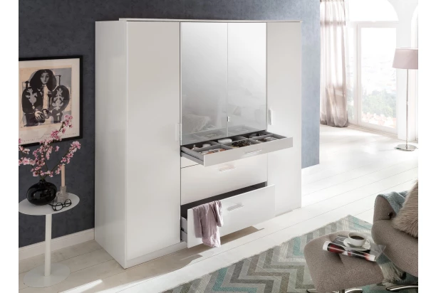 Šatníková skriňa Aachen so šírkou 180 cm v univerzálnej bielej farbe ponúka úložné priestory za 4 dverami, stredové zrkadlá a 4 praktické zásuvky. Horná zásuvka s praktickým vnútorným členením umožňuje prehľadne ukladať drobnú bielizeň alebo doplnky ako opasky, kravaty, šperky, hodinky atď.