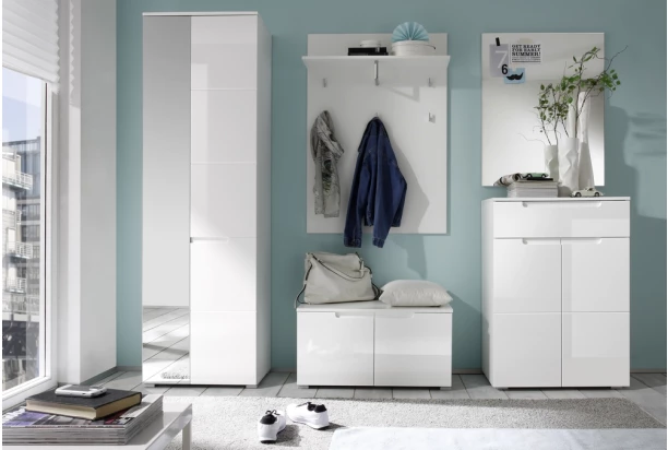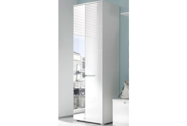 Šatníková skriňa so zrkadlom z radu Spice sa vyznačuje lesklým bielym povrchon s extravagantntnou profiláciou a ideálne sa hodí do nadčasovo zariadenej predsiene.