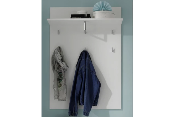 Nástenný vešiakový panel z radu Spice v lesklo bielom prevedení obsahuje odkladaciu policu aj závesné šatníkové háky a ideálne sa hodí do nadčasovo zariadenej predsiene.