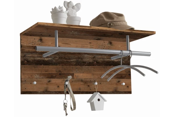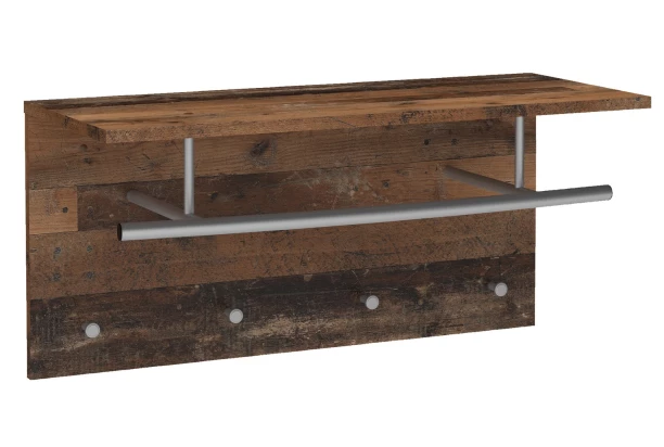 Praktický nástenný panel obsahuje závesné háky, šatníkovú tyč a hornú odkladaciu policu. Môžete ho využiť v predsieni alebo kdekoľvek inde. Vyrobený vo vintage optike drevených dosiek.