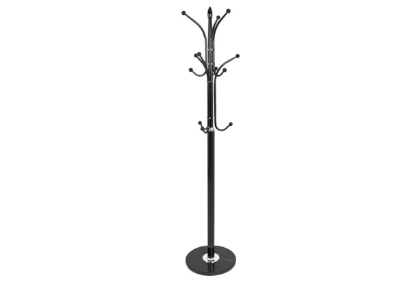 Kovový stojací vešiak v modernom štýle vo farbe čiernej. Pre umiestnenie do modernej predsiene, spálne alebo šatne.