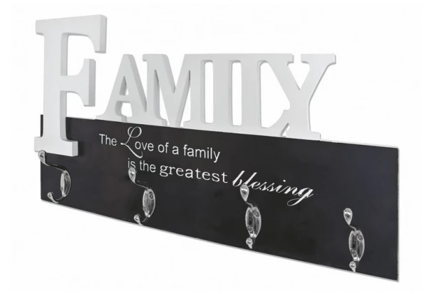 Nástenný vešiakový panel v čierno-bielom prevedení s obľúbeným motívom Family zútulní atmosféru domova. Obsahuje 4 kovové dvojité háčiky pre akékoľvek vešanie šiat, tašiek, uterákov i utierok.