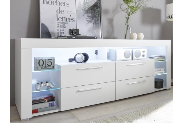 Lesklo biely TV stolík v modernom štýle a s celkovou šírkou 179 cm. Obsahuje úložné zásuvky, otvorené priehradky aj sklenené police s pôsobivým LED osvetlením.