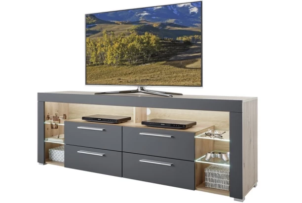 TV stolík v modernom štýle s celkovou šírkou 179 cm, vyrobený v kombinácii dub artisan/šedý vysoký lesk. Obsahuje úložné zásuvky, otvorené priehradky aj sklenené police s pôsobivým LED osvetlením.