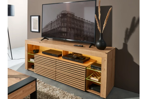 TV stolík v modernom štýle o celkovej šírke 179 cm má optiku širokých rámov a jeho predné plochy dopĺňajú dekoračné lamely. Vyrobený v kombinácii dub artisan/čierny. Obsahuje úložné zásuvky, otvorené priehradky aj sklenené police s pôsobivým LED osvetlením., ktoré dotvára príjemnú večernú atmosféru.