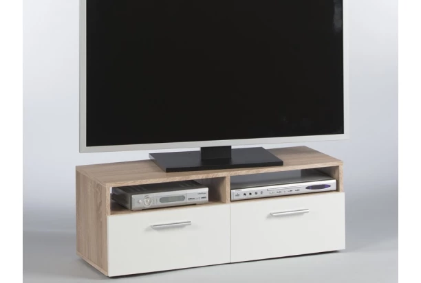 Jednoduchý TV stolík o šírke 95 cm obsahuje drobné úložné priestory. Je úplne univerzálnym doplnkom do akejkoľvek miestnosti – nielen do obývačky. Vyrobený v kombinácii dekoru dub sonoma a bielej farby.
