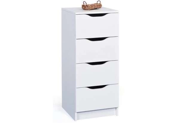 Zásuvková komoda z nadčasovej bielej série Westphalen je charakteristická profilovaným úchytom v zaoblenom tvare. Obsahuje celkom 4 praktické zásuvky a má celkovú šírku 41 cm.