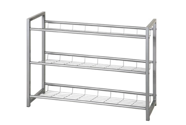 Univerzálny sivý regál na topánky (botník) je vyrobený z kovu a univerzálne sa hodí do akejkoľvek predsiene alebo chodby.