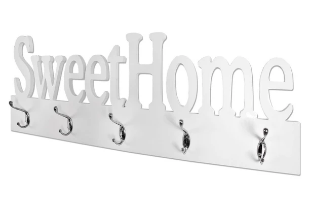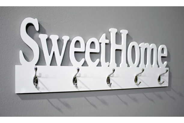 Nástenný vešiakový panel v bielom prevedení s obľúbeným motívom Sweet Home zútulní atmosféru domova. Obsahuje 5 kovových dvojitých háčikov pre akékoľvek vešanie šiat, tašiek, uterákov i utierok.