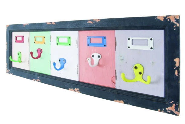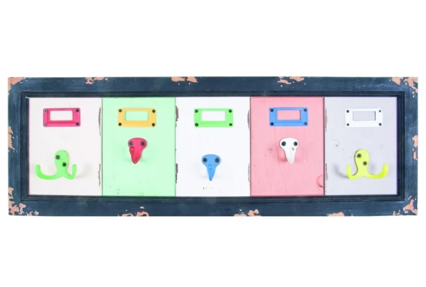 Extravagantný nástenný šatníkový panel z dreva obsahuje 5 kovových háčikov a vtipné menovky. Farebné plochy so zámernou vintage optikou sú trendy a dokonale doplnia interiér v mladistvo zariadenom štýle.