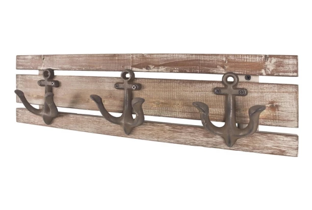 Originálny nástenný vešiakový panel v námorníckom štýle vintage. Tri kovové kotvy slúžia ako závesné háčiky. Skvele tak doplní štýlovo zariadený byt.