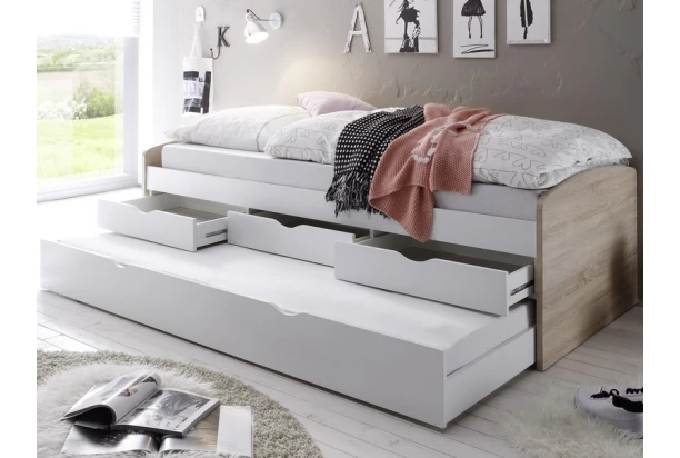 Posteľ s 3 úložnými zásuvkami a prídavným výsuvným lôžkom pre príležitostné spanie v dolnej časti konštrukcie. Nájde praktické využitie v akomkoľvek detskej izbe.